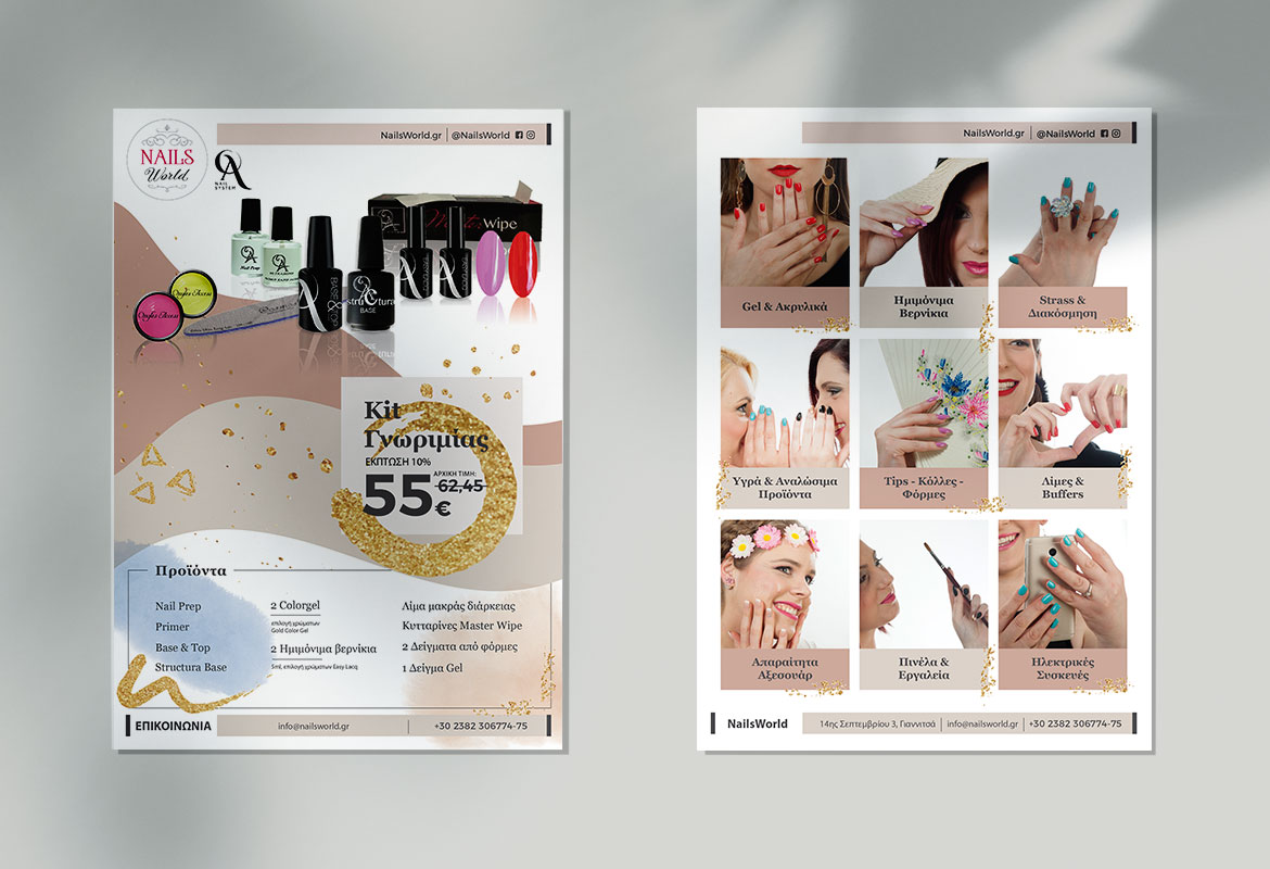 Σχεδιασμός διαφημιστικού εντύπου (flyer) για το κατάστημα εξοπλισμού για τεχνήτριες νυχιών NailsWorld.